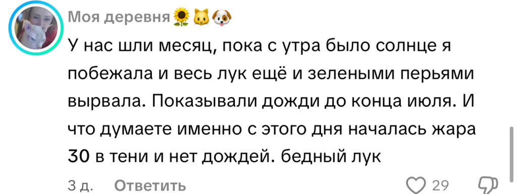 В сети гуляет история, как одна женщина, поверив обещаниям синоптиков о дождях до конца июля, поспешила собрать лук, пока он еще не сгнил. И что вы думаете? Именно с этого дня началась жара 30 градусов в тени и ни капли дождя! Бедный лук.