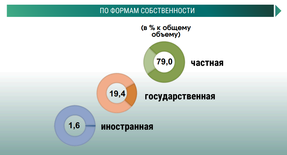Государственная собственность, представленная преимущественно крупными проектными институтами и подрядными организациями, занимает существенную, но второстепенную роль – 19,4%.