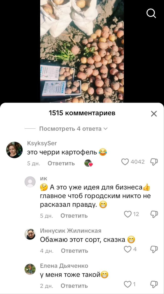 Зрители подхватили задорный настрой автора и в комментариях предлагали свои варианты. К примеру, назвали сорт картофельным черри, другой предложил назвать сказкой.