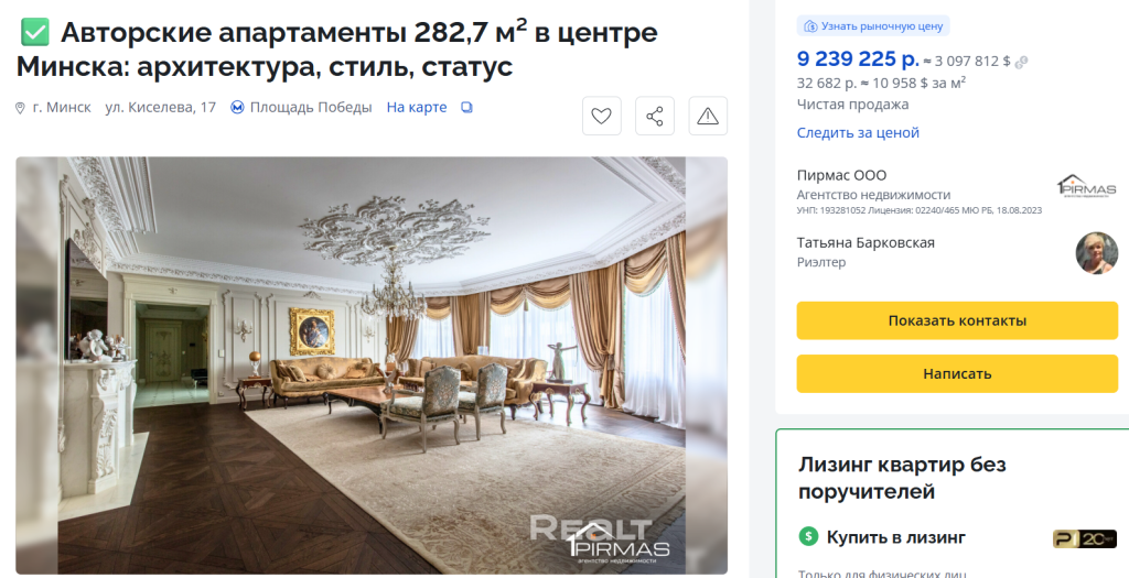 Среди квартир с самым высоким ценником – трехкомнатные авторские апартаменты рядом с метро Площадь Победы за 9 239 225 белорусских рублей. Объект выглядит действительно по-царски: массивные деревянные столы, диваны, скульптуры, множество стульев с мягкими спинками. Так многие представляют себе жилье аристократов прошлых веков. Насколько такой интерьер, больше напоминающий комнаты музея, удобен в современном быту, конечно, вопрос хороший. Покупка такого жилья – это скорее приобретение статуса, арт-объекта, нежели просто квадратных метров.