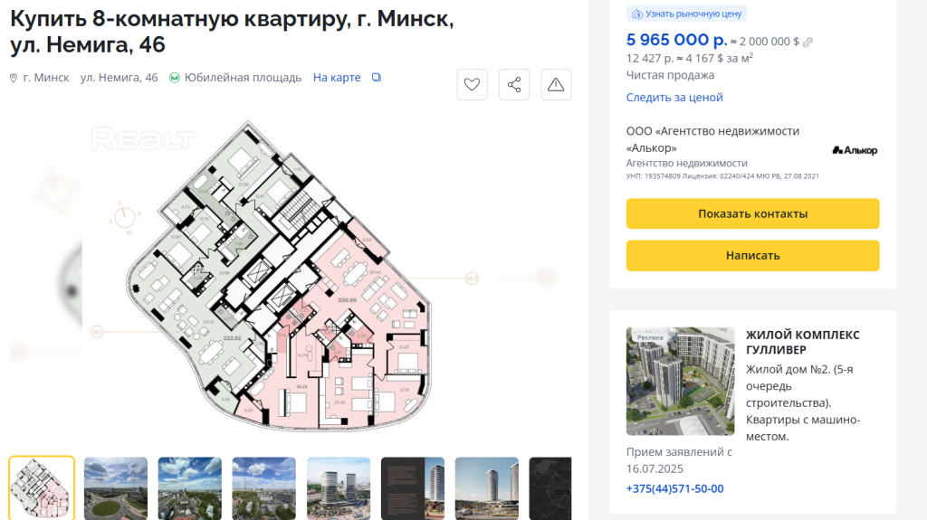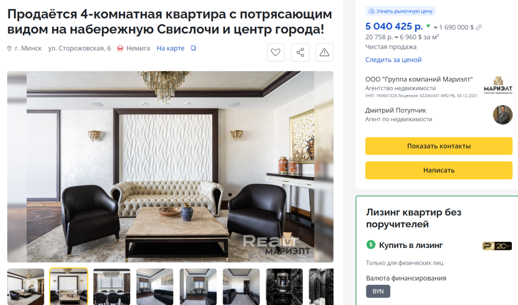 Еще один претендент на звание эксклюзивного предложения – целый этаж за 5 965 000 белорусских рублей. В описании говорится о хорошей шумоизоляции, закрытом дворе, красивом внешнем виде, отмеченном наградами на архитектурных фестивалях. Расположение, судя по всему, и правда весьма премиальное: совсем рядом метро Юбилейная площадь. Стоит ли целый этаж таких денег? Ответ на этот вопрос зависит исключительно от кошелька и амбиций покупающего.