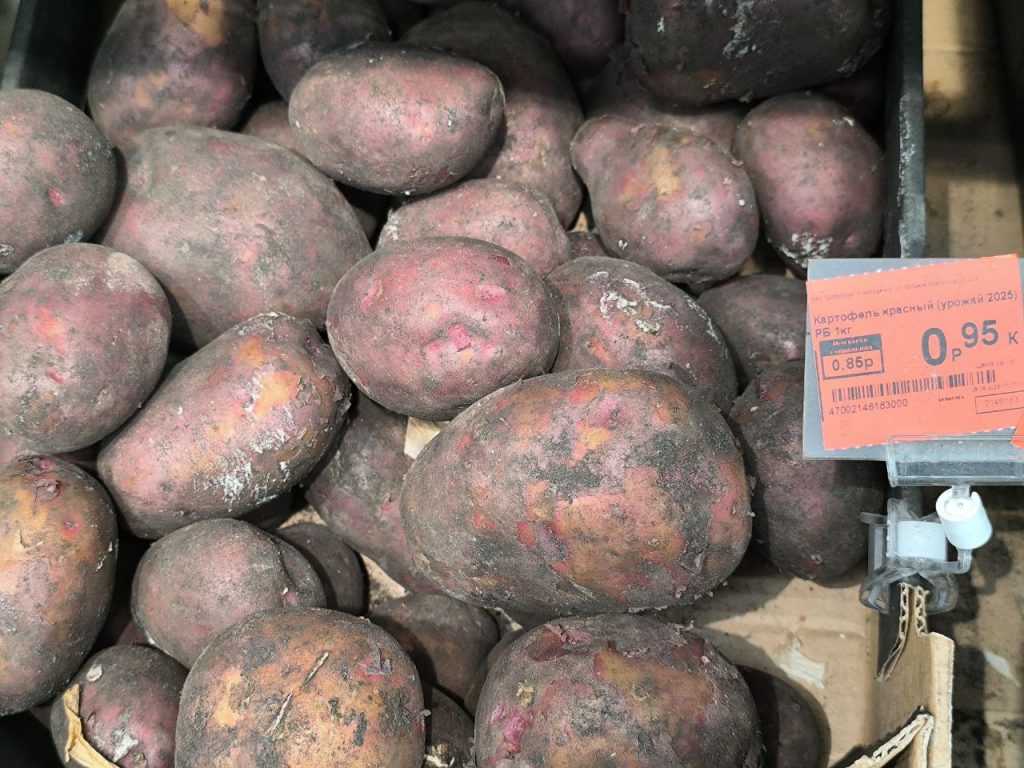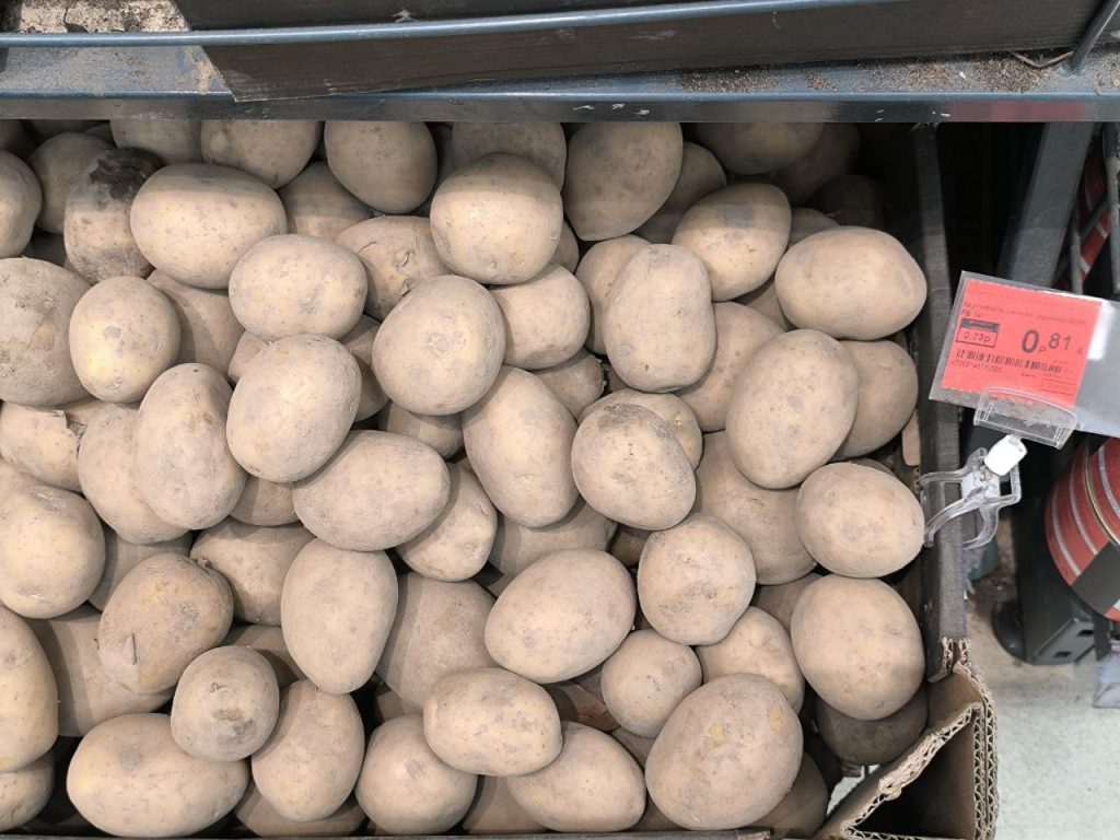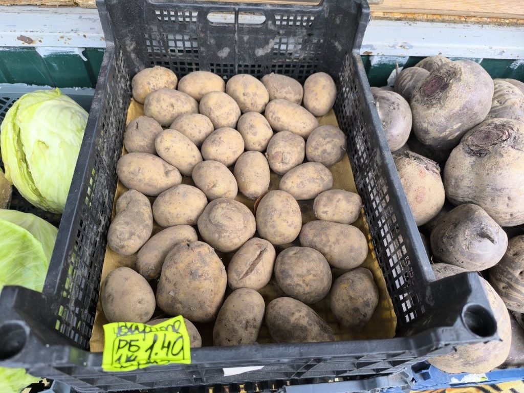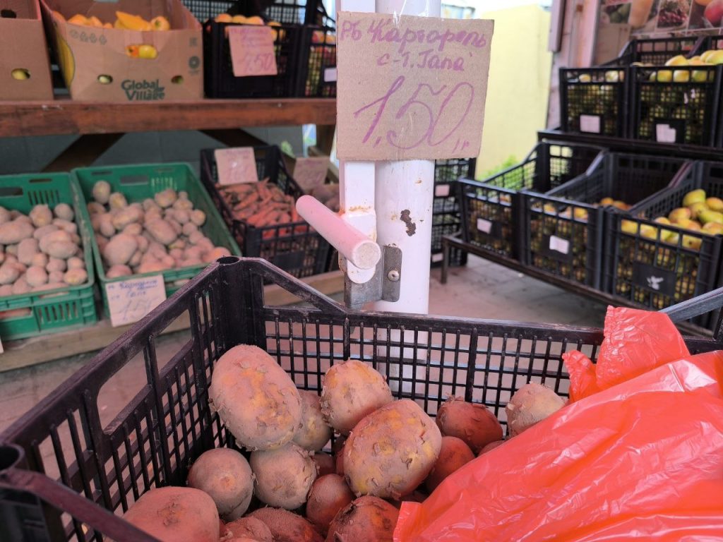 В торговом объекте, что напротив рынка, привычные нам светлого цвета клубни — по 81 копейке (0,73 руб. соц.) и по 95 копеек (0,85 руб. соц.) за килограмм.