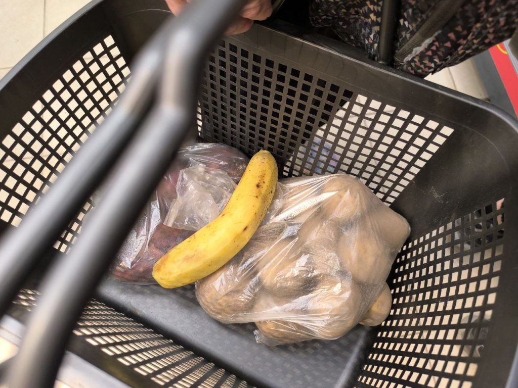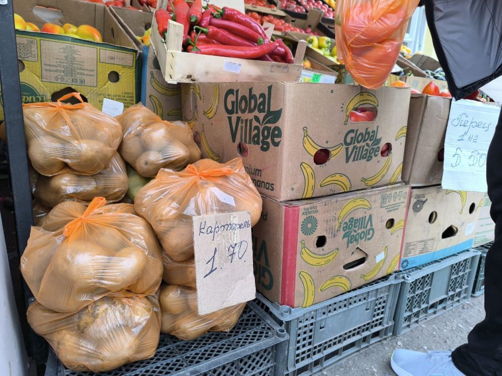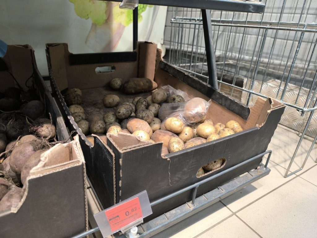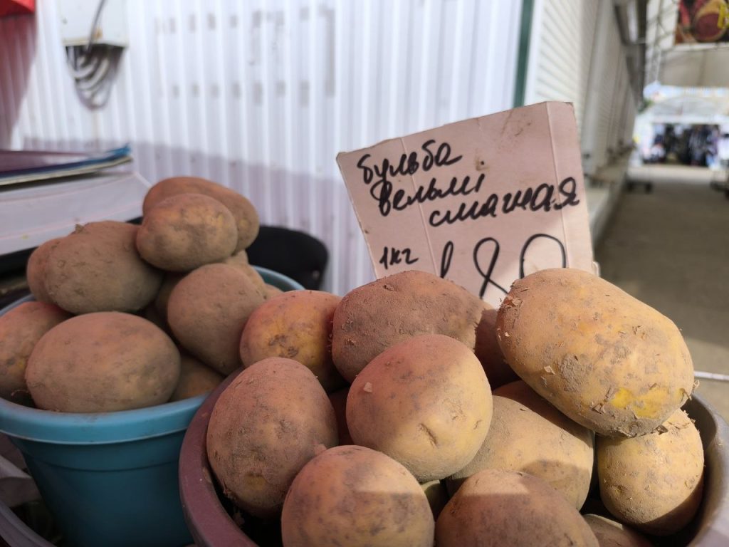 В торговом объекте, что напротив рынка, привычные нам светлого цвета клубни — по 81 копейке (0,73 руб. соц.) и по 95 копеек (0,85 руб. соц.) за килограмм.
