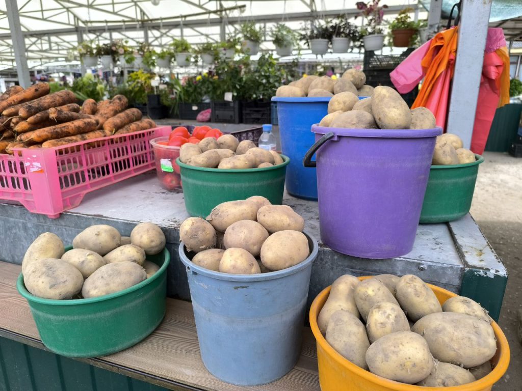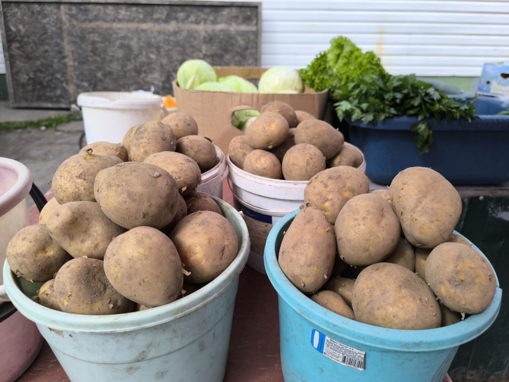 На торговых рядах картошка и «дешевеет», и «дорожает» — в зависимости от сорта и вкусовых качеств. Её здесь не попробуешь, конечно, остается только верить на слово (и запись на картонке) продавцам.