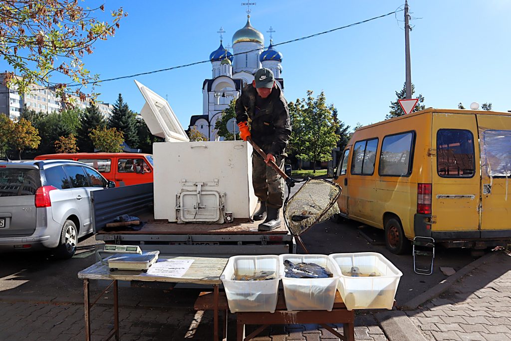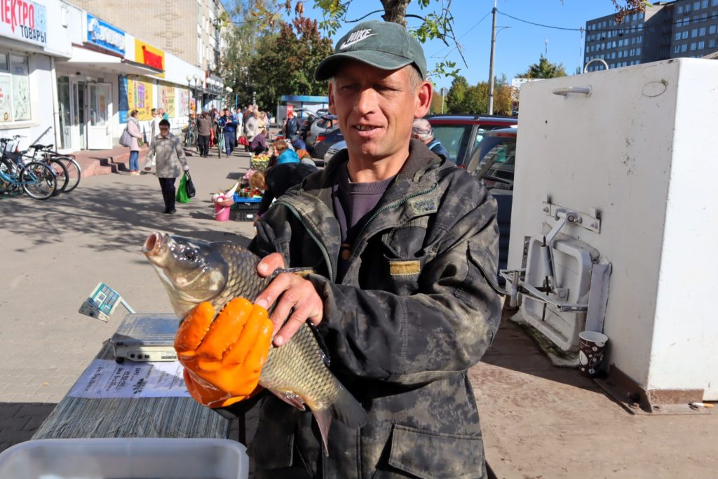 В пятницу живую рыбу в Молодечно продавал Виктор из рыбхоза «Грицево», что в Лебедевском сельсовете. Доставал он чешуйчатую вкусняшку из «аквариума»-холодильника и весело предлагал покупателям:
