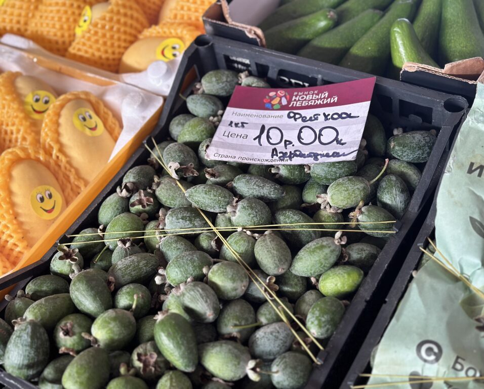 На «Новом Лебяжьем» появляются интересные новинки. Вот, например, фейхоа — фрукт из Азербайджана — продают от 10 рублей за килограмм оптом и до 15 — в розницу.