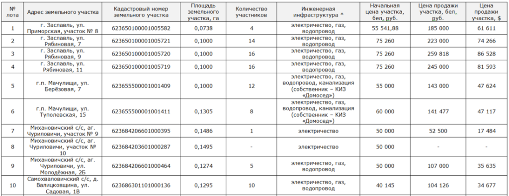 Заславский горисполком предложил на аукцион 4 участка на улицах Приморской, Рябиновой, 7, Рябиновой, 9, и Рябиновой, 11. Земельные наделы пользовались повышенным спросом. Так, на участок на ул. Рябиновой, 7, зарегистрировалось 14 человек, на ул. Рябиновой, 9 — 16, на ул. Рябиновой, 11 — также 16 человек. Участки насчитывают по 10 соток и оснащены электричеством, газом и водой. Они были выставлены на аукцион по одинаковой стартовой цене — за 75 260 рублей каждый. В ходе торгов цена на участок на Рябиновой, 7, увеличилась до 223 000 рублей, или 74 266 долларов по курсу Нацбанка на день проведения аукциона. Участок на Рябиновой, 9, удалось продать за 259 818 рублей, или 86 528 долларов, а на Рябиновой, 11 — за 245 000 рублей или 81 593 доллара.