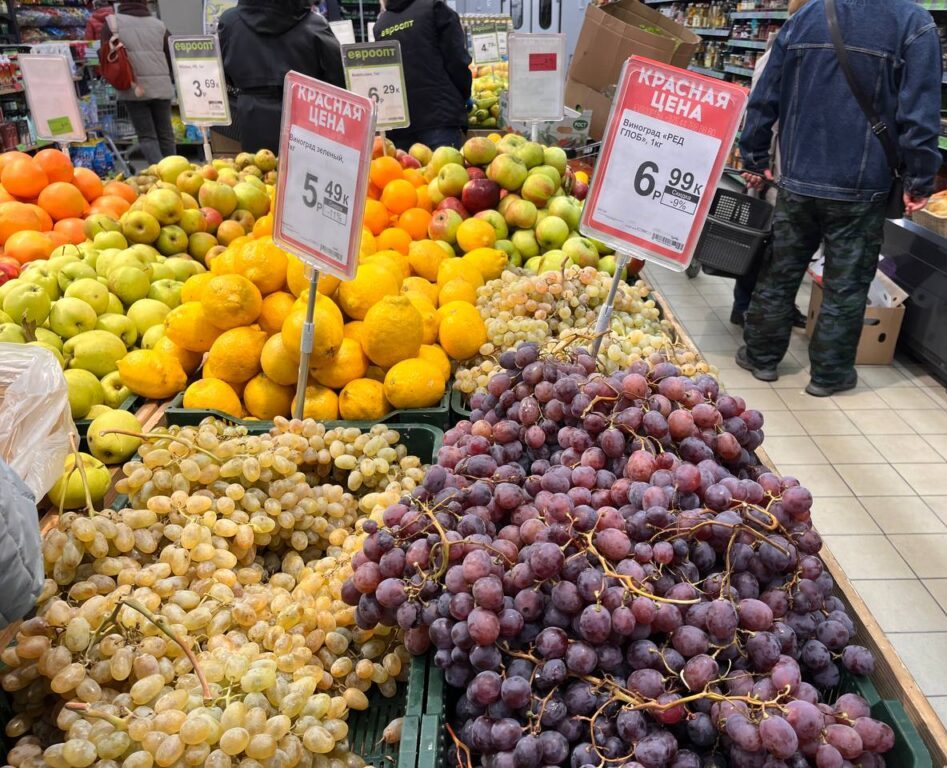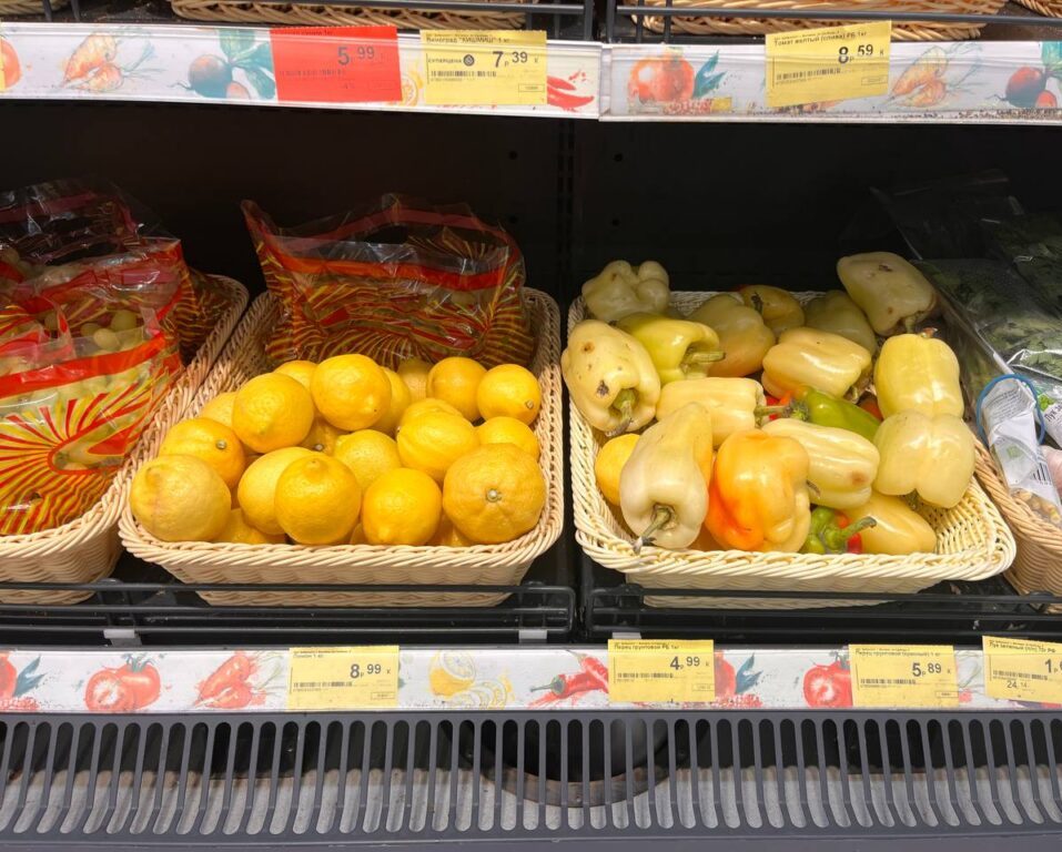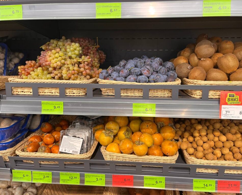 А вот фрукты и тепличные овощи — наоборот, дороже. Огурцы — 4,99–6,99 руб., томаты — 6,89–8,59 руб., перец — 4,79–11,99 руб., виноград зелёный — 5,39–8,19 руб., тёмный — 5,99–6,99 руб., лимоны — 8,99 руб., гранаты — 5,99 руб., киви — 7,59–7,99 руб., питахайя — 10,99 руб. за килограмм.