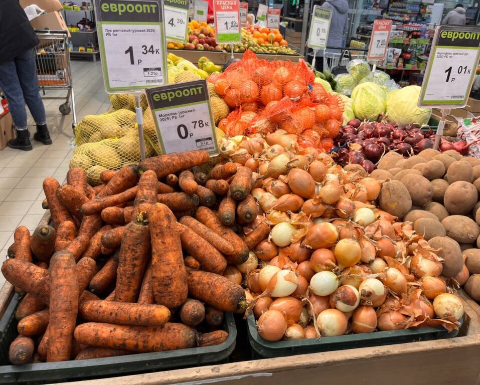 Там базовые овощи немного дешевле: картофель — 0,99–1,05 руб., красный — 1,15 руб., свекла — 0,95–0,99 руб., морковь — 0,78–0,89 руб., капуста — 0,99 руб., цветная — 6 руб., лук репчатый — 1,29–1,79 руб.