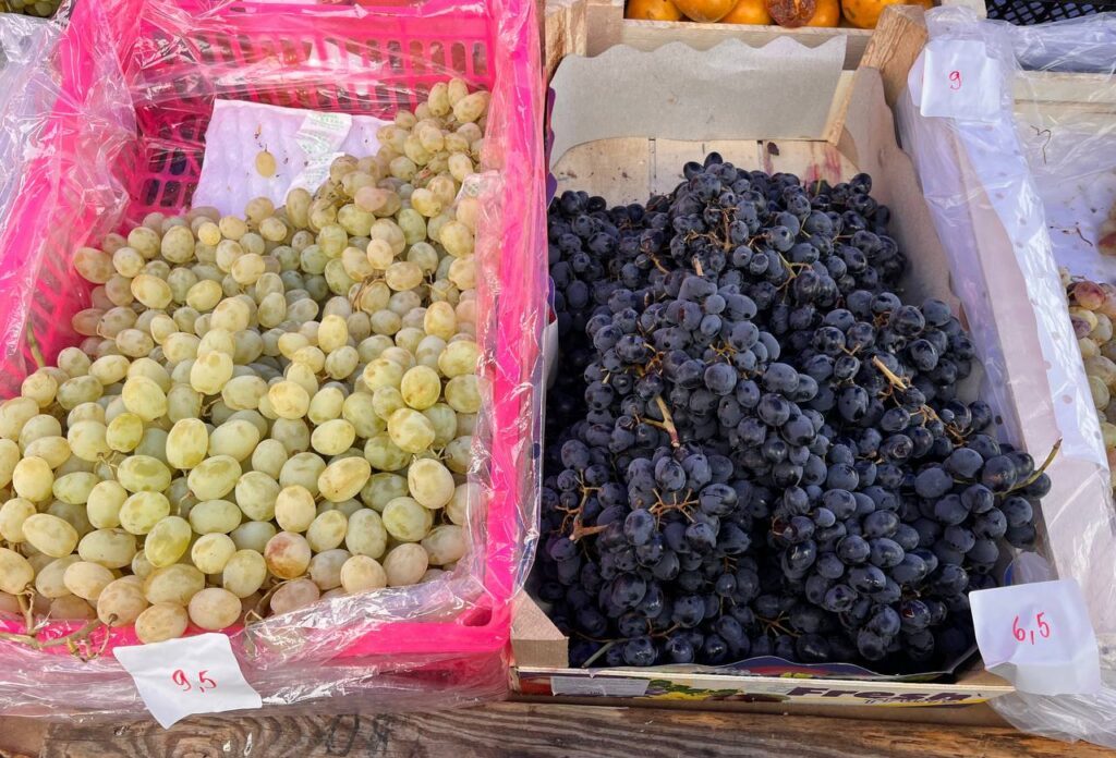 Яблоки — 4–4,50 руб., тёмный виноград — 6–8 руб., зелёный — 8–9,50 руб. Но был и редкий сорт, тот самый Shine Muscat, крупный, как помидорка черри, — по 15 руб., за килограмм.