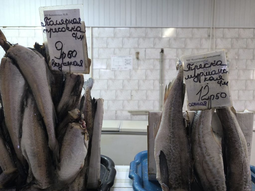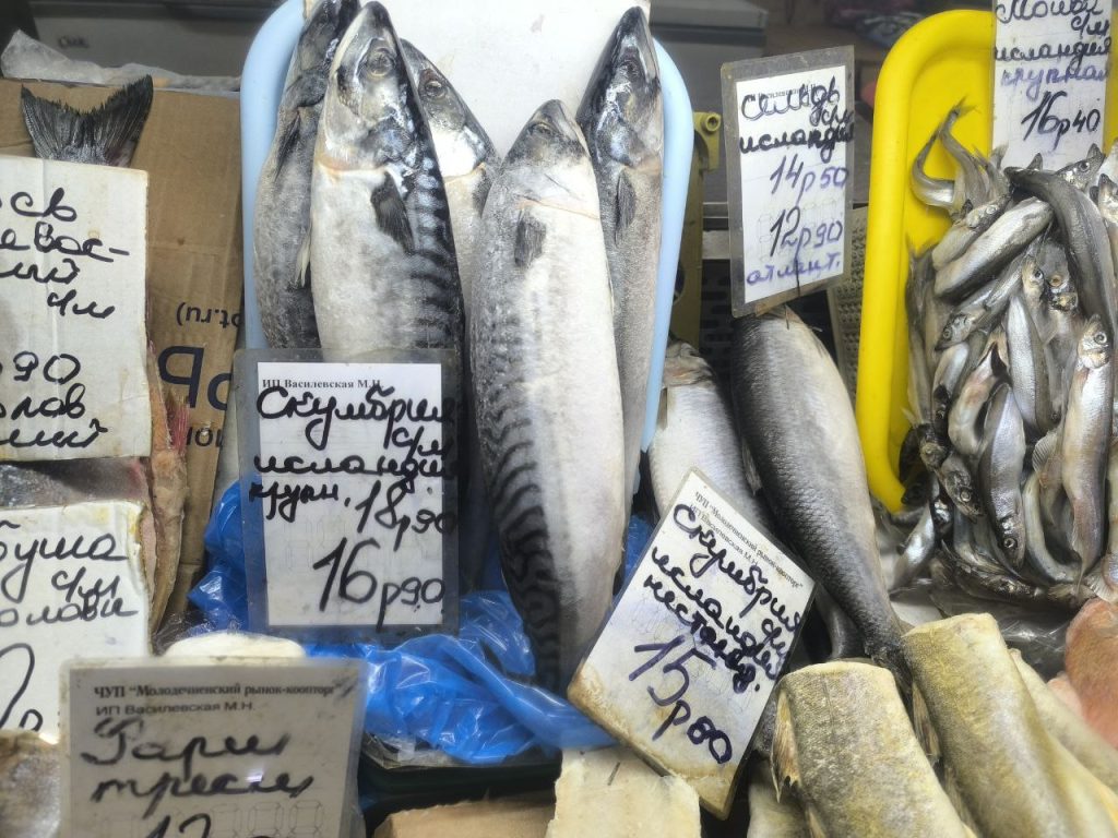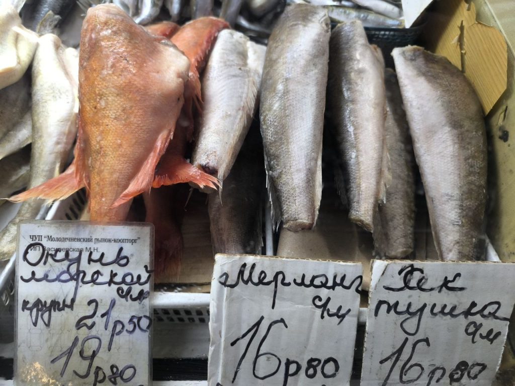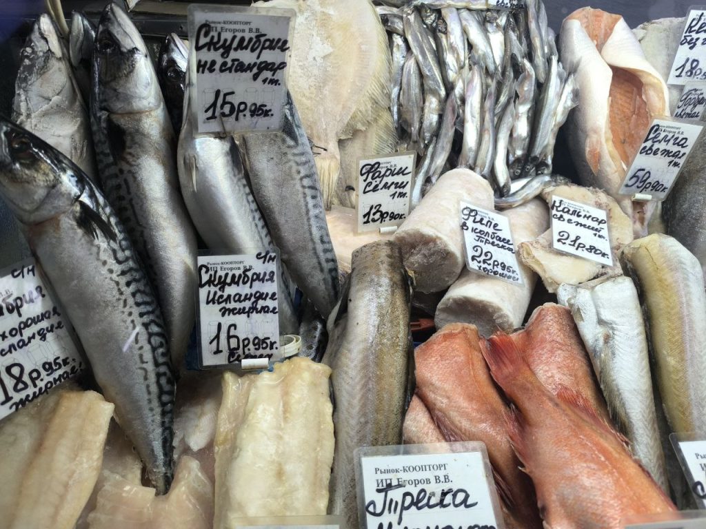 На базаре скумбрия по 16 рублей 90 копеек и 15 рублей 80 копеек, хек по 16 рублей 80 копеек, килька по 10,80 рубля. Треска «Мурманская» по 12 рублей 50 копеек и «Полярная» по 9 рублей 80 копеек, окунь морской по 19,80 и 21,50 рубля, мерланг по 16 рублей 80 копеек, нототения по 16,80 рубля, семга — 59 рублей 90 копеек — всего не перечислить.