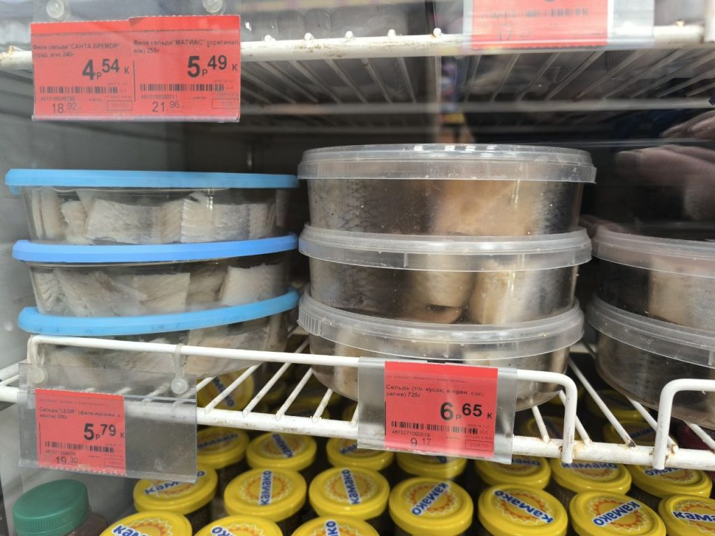 Для любителей готовой сельди — в банках соленая по 6 рублей 65 копеек, в рассоле 725 грамм по 5 рублей 79 копеек.