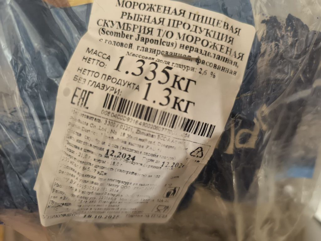 В магазине по улице Машерова смутила дата изготовления скумбрии — 12.2024, хотя дата фасовки вполне приемлема — 18.10.2025. Цена акционная — 9,99 рубля за килограмм.