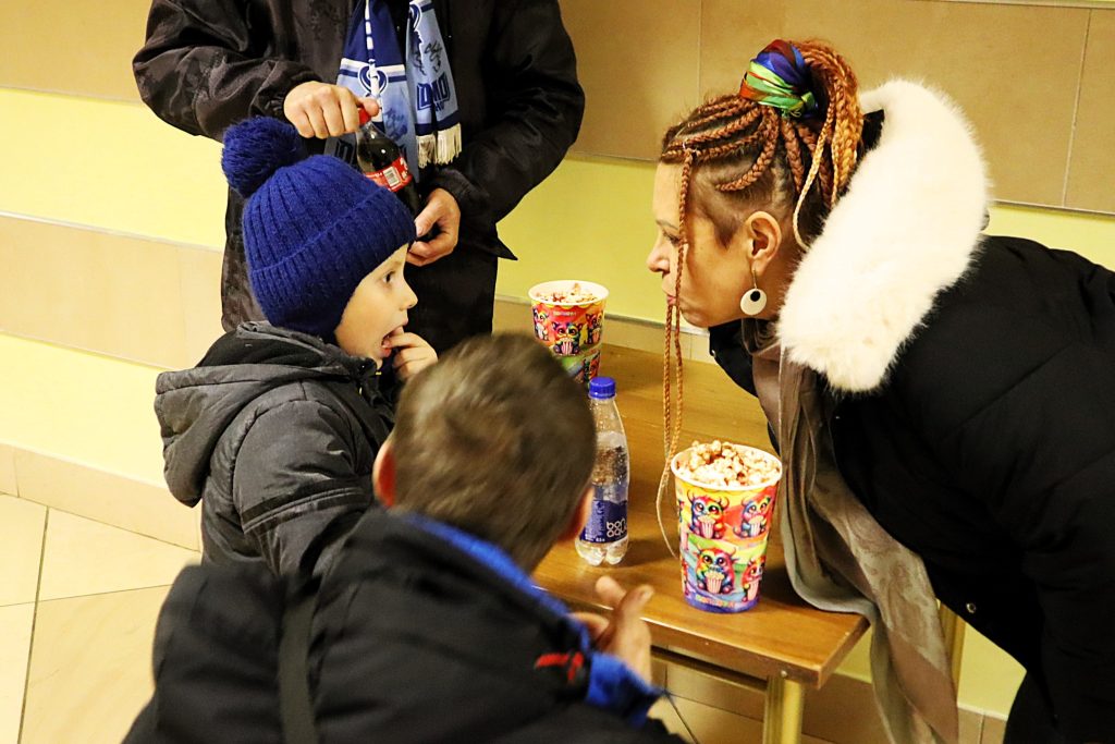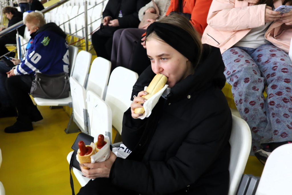 На хоккейных матчах молодечненцы стараются получить полный набор удовольствий. Спортивное зрелище – это, конечно, хорошо, но в базовой комплектации со зрелищами испокон веков идет хлеб, поэтому покушать болельщики тоже не дураки. Ужины в холле ледовой арены бывают даже семейными.