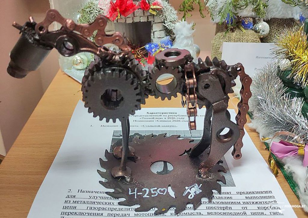 На выставке внимание привлекает экспонат, представленный на республиканский этап в номинации «Символ 2026 года» – «Стальной скакун». В его создании использованы шестеренки, гайки, цепи от велосипедов и других механизмов, что придает работе особую уникальность.