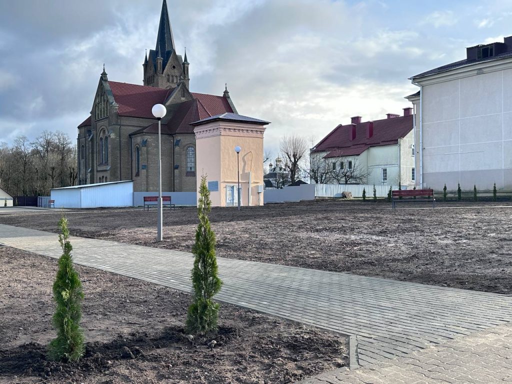 После сноса старых построек открылся прекрасный вид на возвышающийся Крестовоздвиженский костел, ставший живописным фоном для нового общественного пространства.