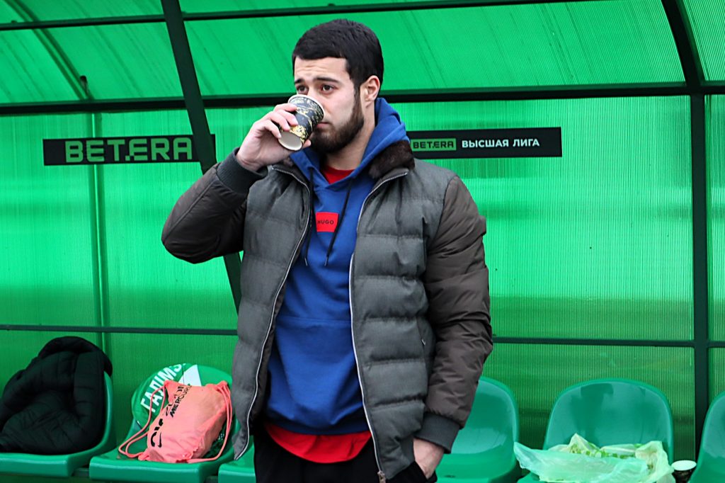 В перерыве игры российский форвард «Молодечно» Алекс Раджабов согревался кофейком возле своей скамейки запасных. При этом одет любимец молодечненских болельщиков был далеко не футболку, трусы и бутсы, а вполне себе по гражданке.