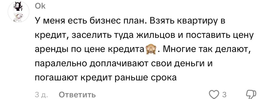 Есть и те, кто рассматривает аренду как бизнес-план: «Взял квартиру в кредит, заселил жильцов, они и выплачивают».