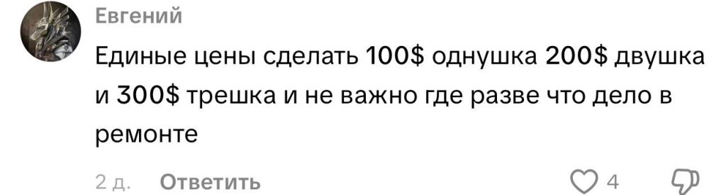 Есть и радикальные идеи: «Сделать единые цены: 100$ однушка, 200$ двушка, 300$ трешка».