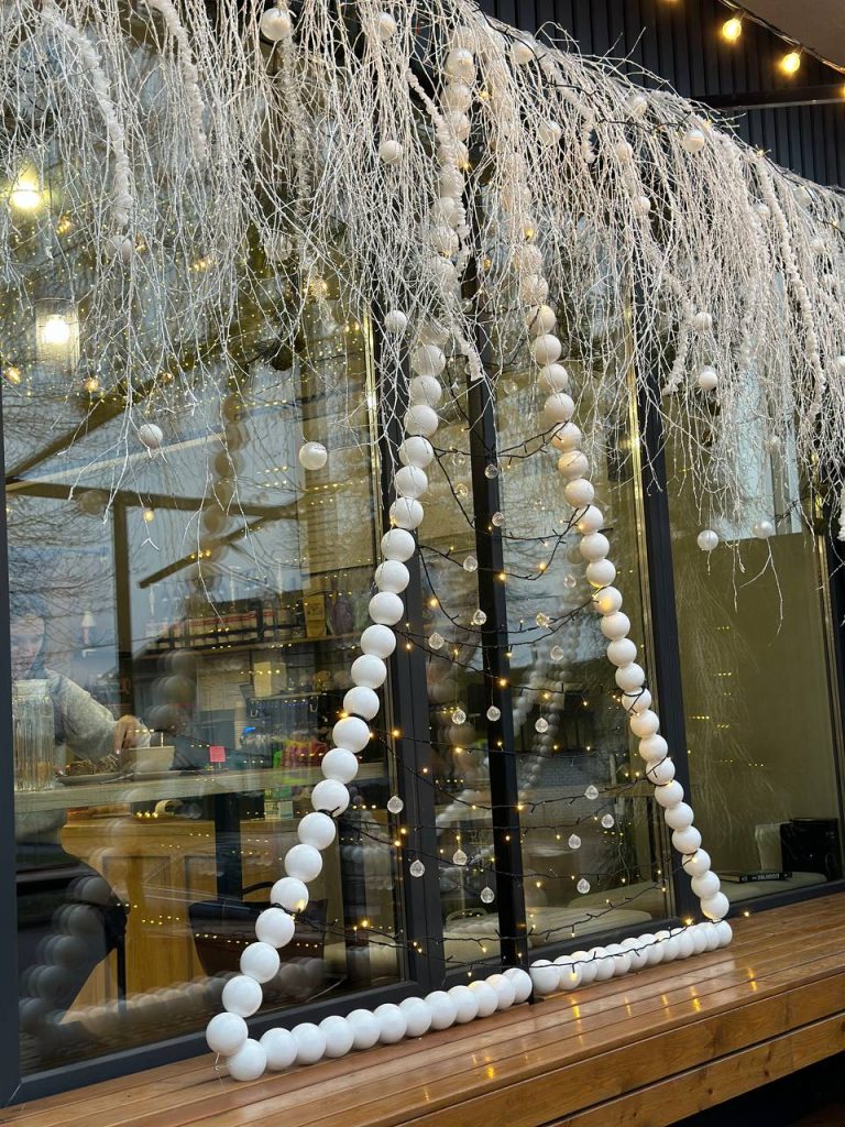 Снежинки, шары и еловые лапки дополняют картину, а с витрины на прохожих смотрят очаровательные праздничные и мультяшные персонажи.