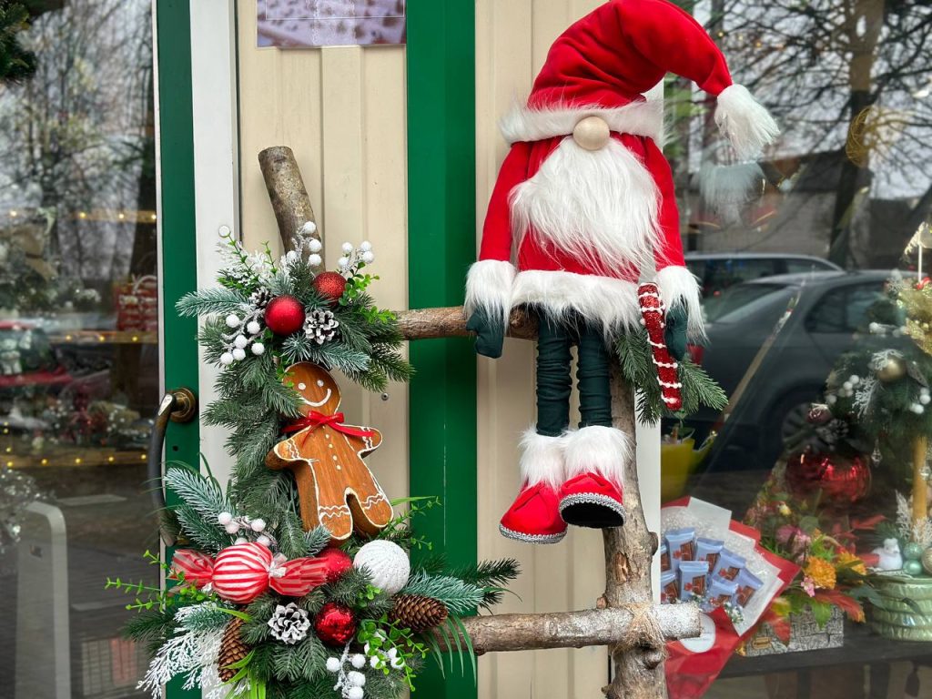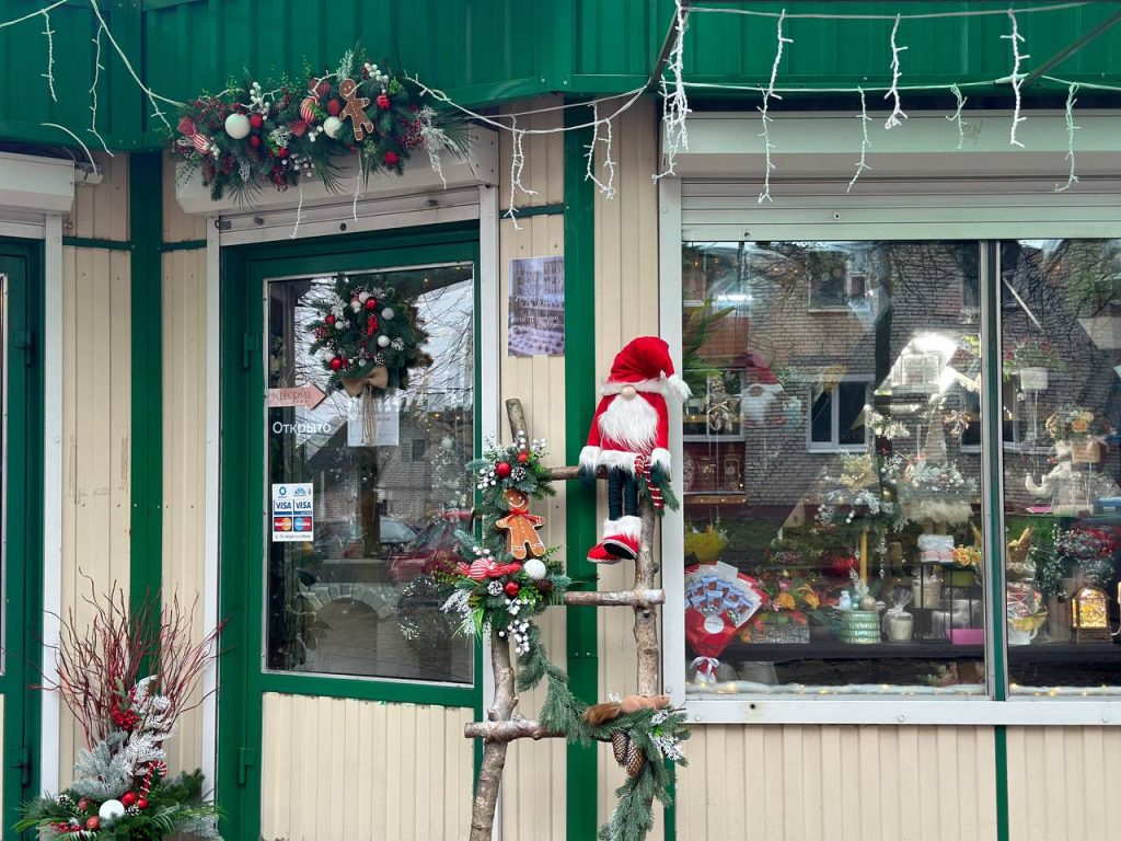 На улице Пионерской павильон с декором ручной работы привлекает внимание лестницей с Сантой и забавной фигуркой имбирного пряника.
