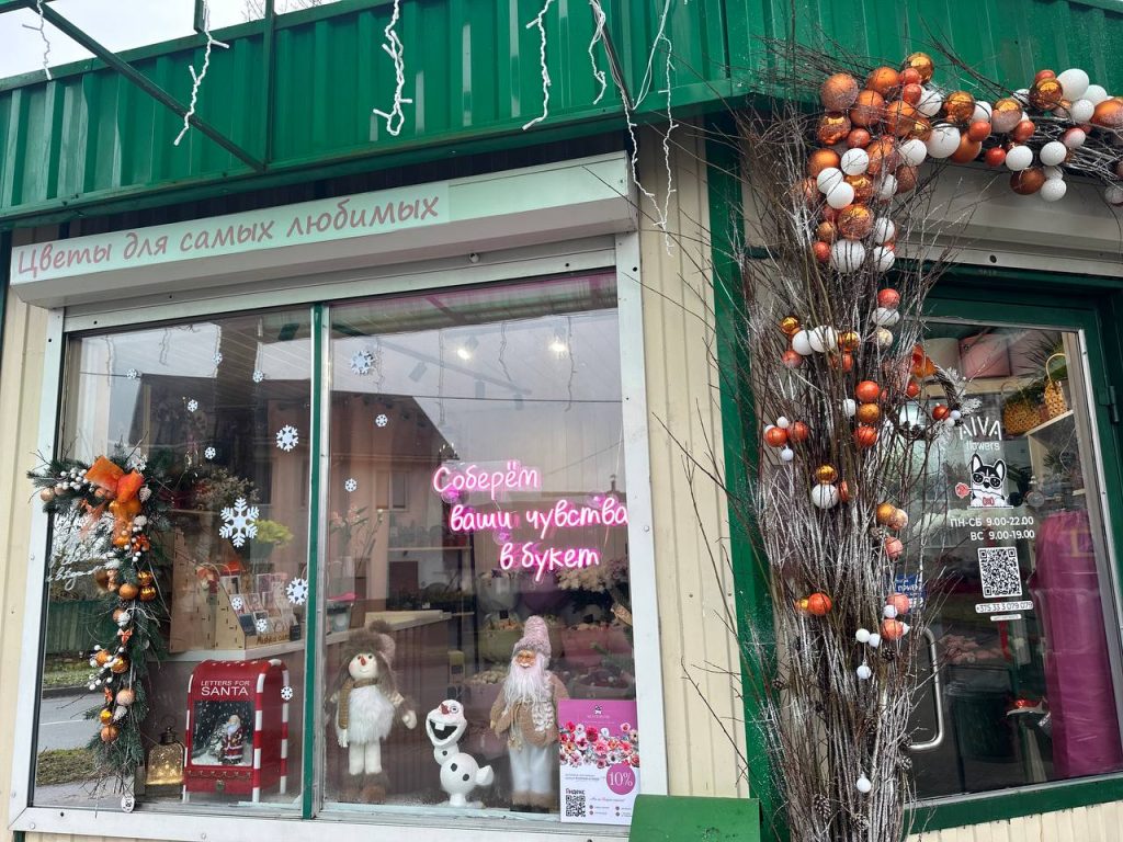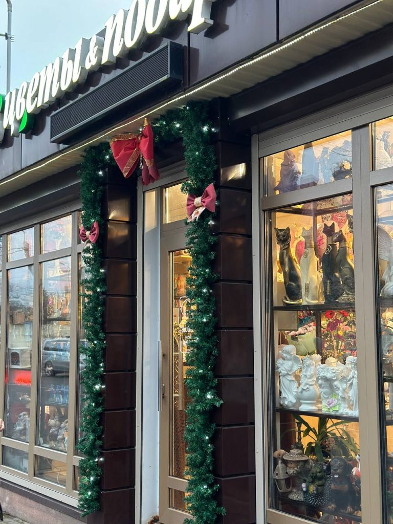 Впечатляет и лаконичное, но стильное оформление входа в магазины. Как, например, еще в одном цветочном магазине, где аккуратным штрихом подчеркнута атмосфера праздника.