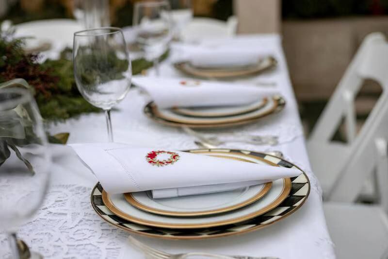 – Первый – изысканный стиль «английская аристократия». Это когда подстановочная, закусочная и основная тарелки образуют элегантную многоярусность. Удачно дополнит композицию сложенная салфетка, сочетание хвои имерцающих свечей.