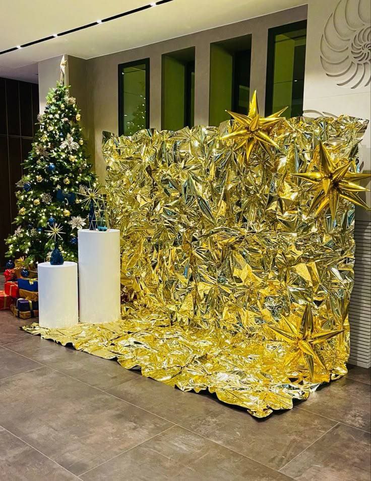– Возьмите каркас, обмотайте его пищевой плёнкой, приклейте полоски двустороннего скотча, скомкайте пищевую фольгу и приклейте к скотчу. Украсить такую фотозону можно любыми атрибутами, которые в изобилии представлены даже в магазинах низких цен, – поделилась декоратор.