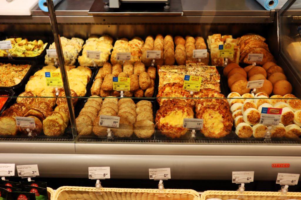 В ассортименте товаров – свежая выпечка, которая готовится на месте, десерты из кондитерского цеха.