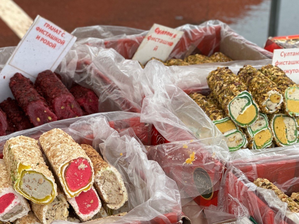 Аппетитно выглядели восточные сладости: пастила, рассыпной ароматный чай, конфеты , орехи и сухофрукты.