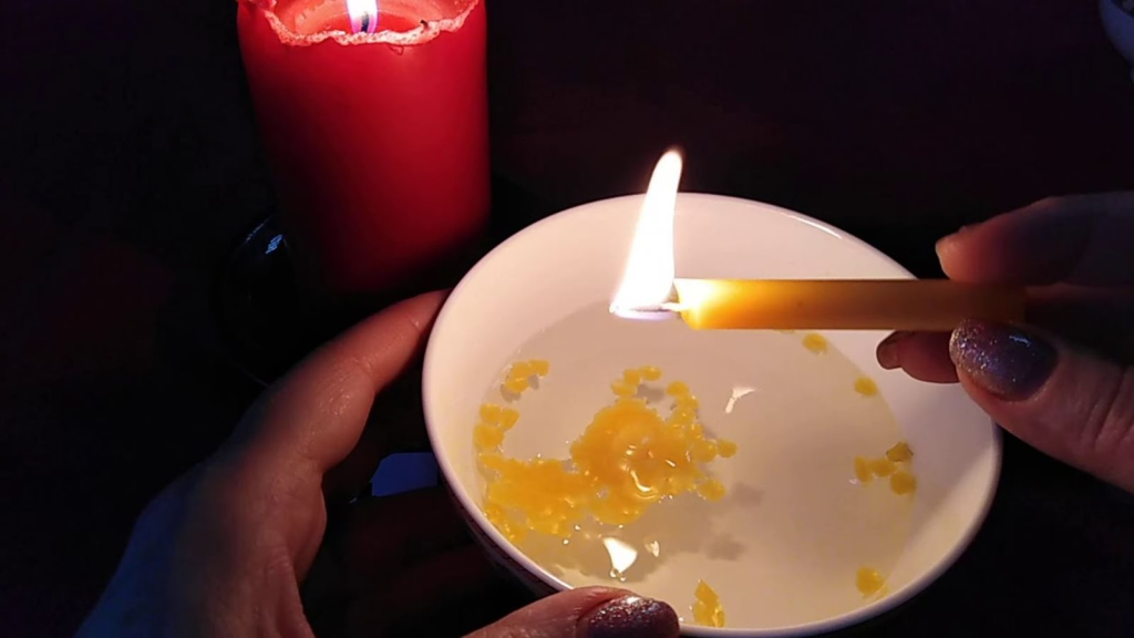 - Гадание на воске. Растопите свечу и вылейте воск в миску с холодной водой. Причудливая фигура подскажет, что ждёт в будущем: колесо — к дороге, цветок — к любви, дом — к семейному благополучию. Остальные варианты подскажет ваша фантазия.