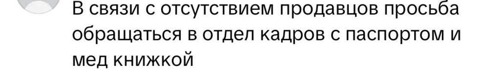 Ребята зашли за покупками и подошли к рыбному отделу. Рыба есть. Витрина блестит. Ассортимент радует. Не хватает только одного — продавца. Зато на видном месте стоит рамка с аккуратной табличкой и вежливой просьбой: при отсутствии продавца обращаться в колбасный отдел.