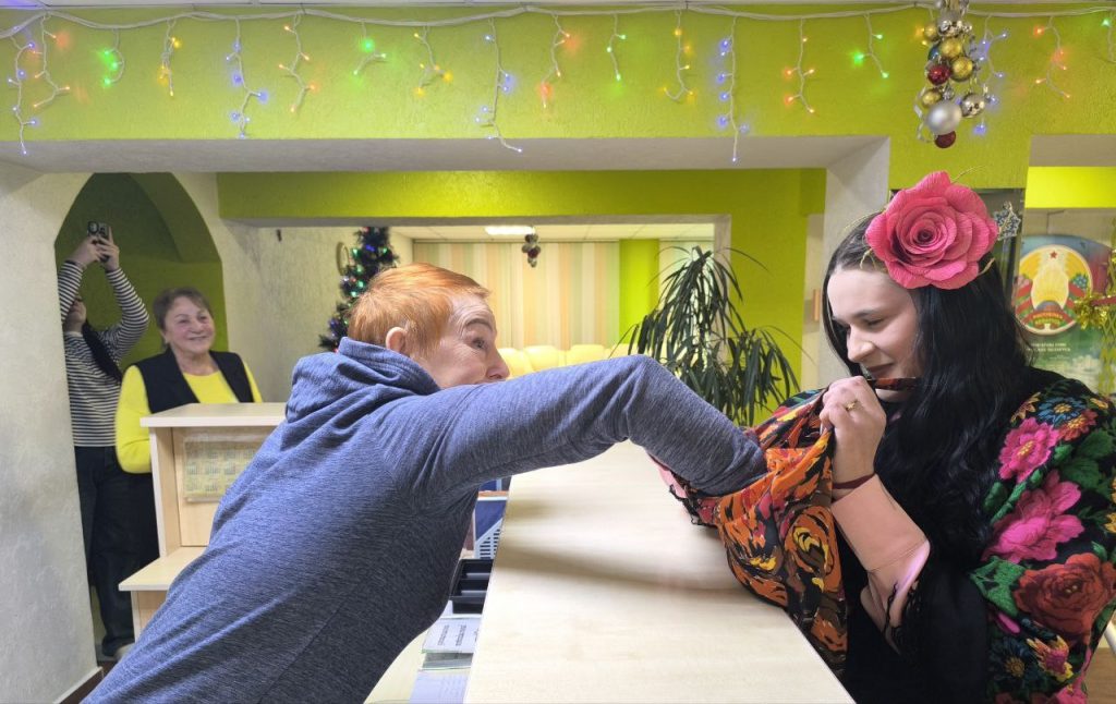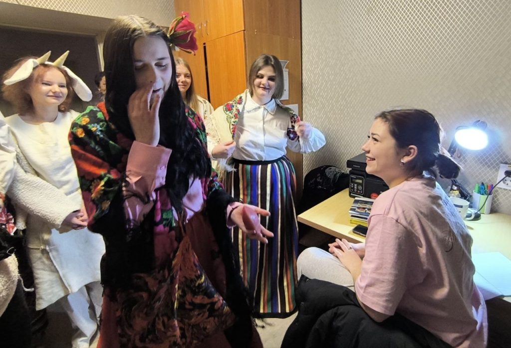 В ярких образах, с колядной звездой и песней «Учора з вячора» артисты пожаловали первыми к Елене Владимировне. Работница общежития с интересом встретила народных персонажей, «паваражыла на будучыню» с Цыганочкой Викторией и, следуя добрым традициям гостеприимства, щедро угостила колядовщиков вкусностями.