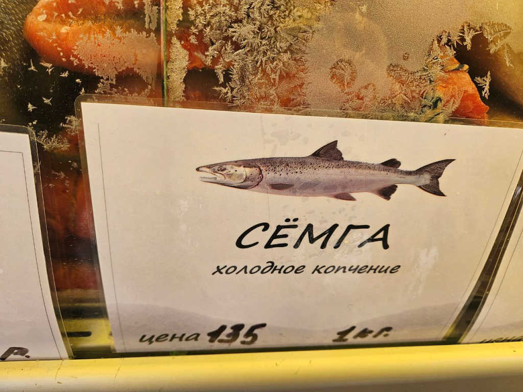 А вот стоимость сёмги холодного копчения указана в килограммах: 135 рублей.