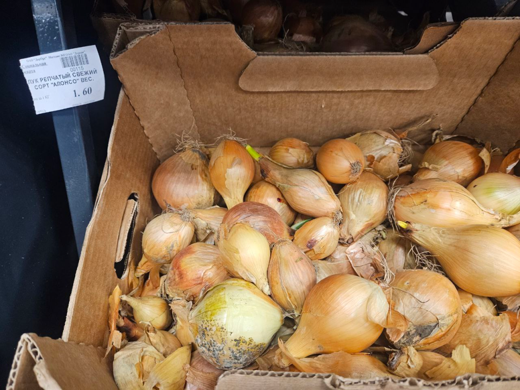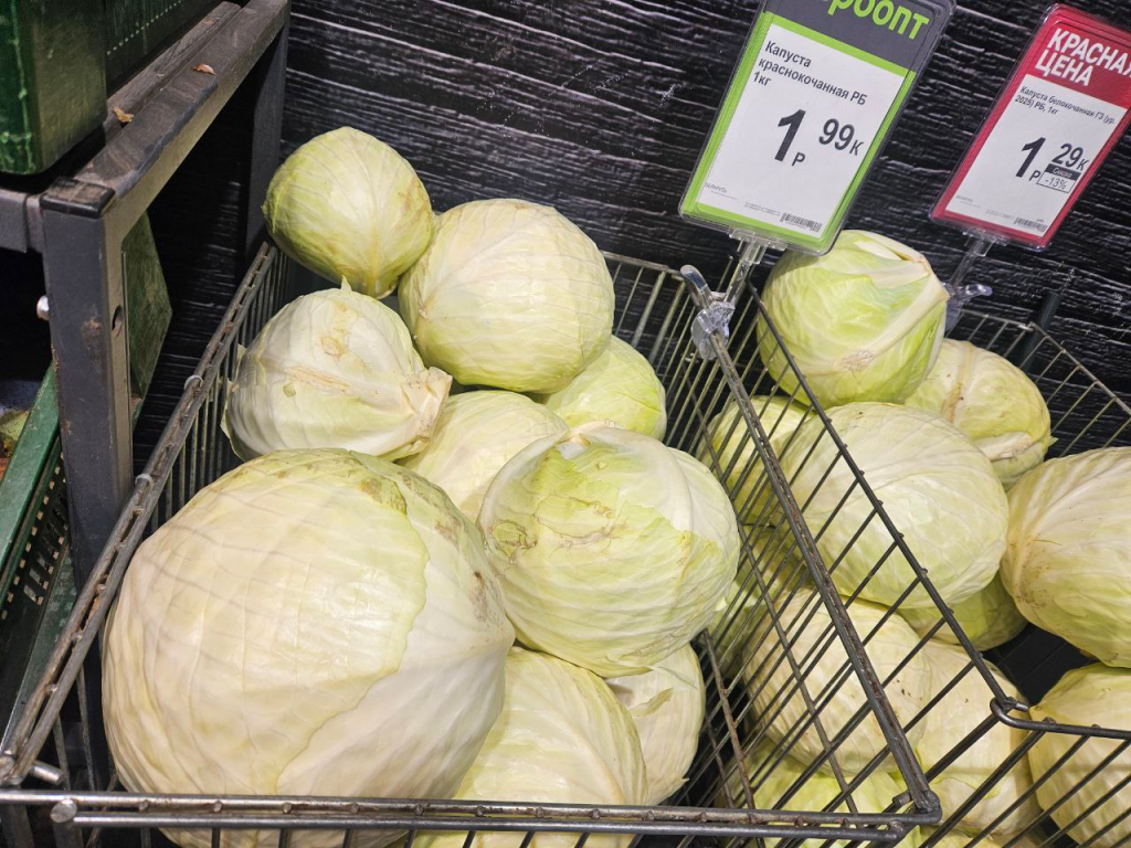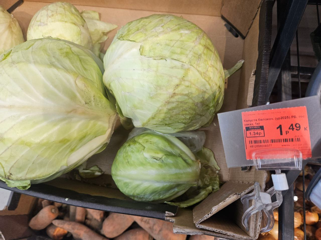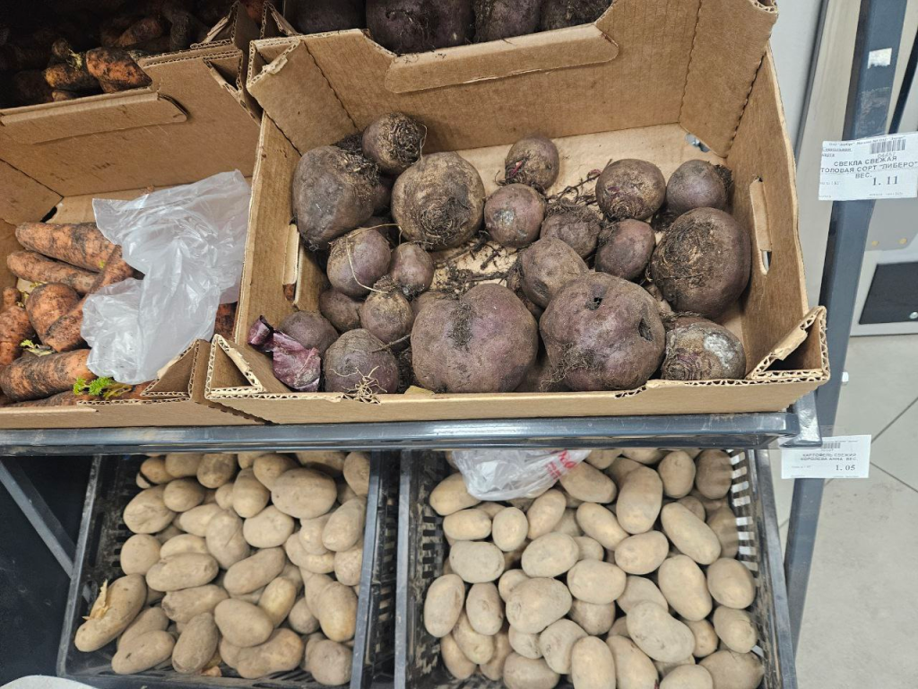 Картофель — 1 рубль 5 копеек, свёкла по 1 рублю 11 копеек, лук репчатый свежий по 1,60 рублей, капуста белокочанная — 1 рубль 54 копейки.