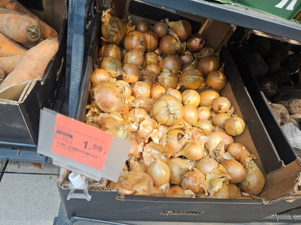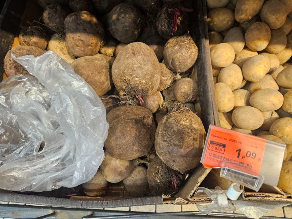 Свёкла по 1,09 рублей, лук репчатый по 1,59 рублей, морковь по 1,25 рублей, картофель — 0,99 рублей.