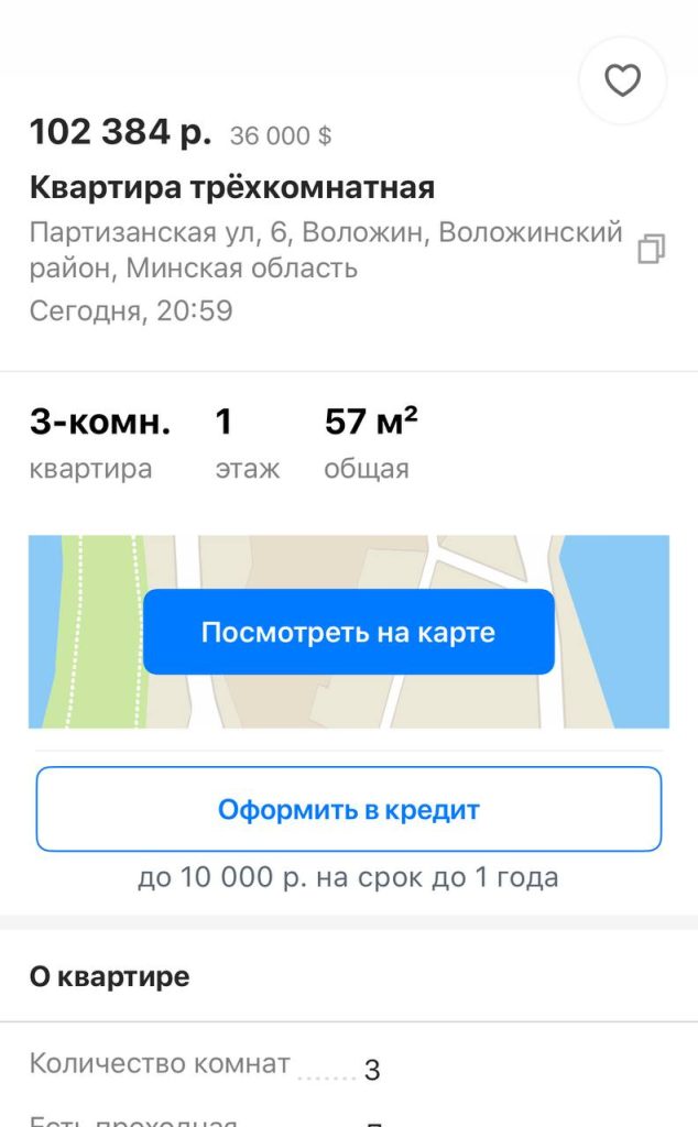 В Воложине трёхкомнатная квартира площадью 57 квадратных метров стоит около 36 тысяч долларов, цена одного метра здесь ниже, чем в Ивенце. Центр города, стандартный вариант с выраженными преимуществами, когда всё рядом.