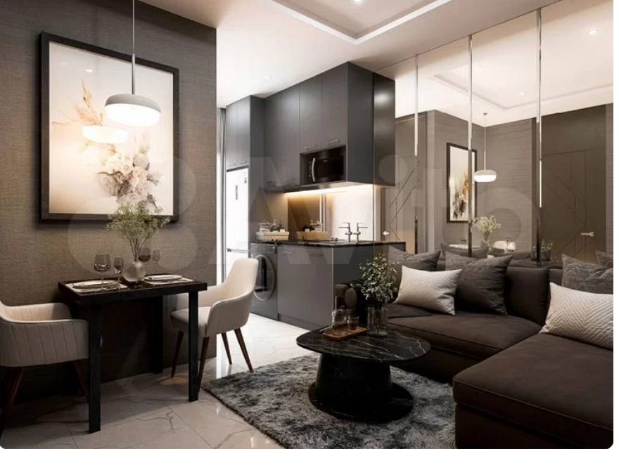 Это однокомнатная квартира с готовым ремонтом и мебелью: кухня, ванная, гардеробная, кондиционеры, панорамные окна, балкон. В комплексе есть бассейн, спортзал, зоны отдыха, закрытая территория и консьерж. До моря около 250 метров.