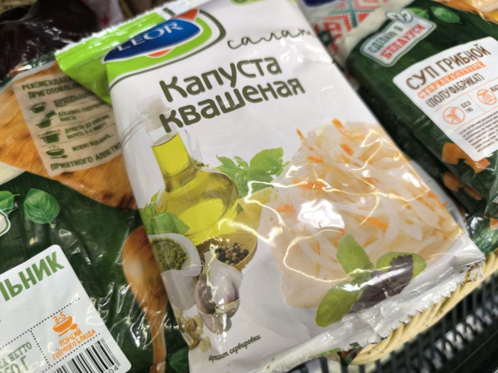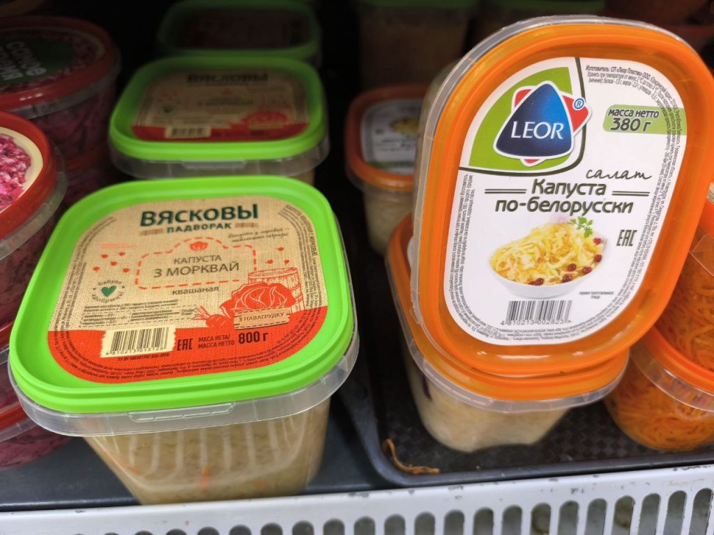 Но объём ёмкости разный, значит смотрим цену за килограмм. «Капусту по-белорусски» предлагают по 9 рублей 18 копеек, квашеную с забавными надписями «Капуста з морквай — найлепшыя сяброўкі» и «Бабуля адобрыць!»- 5 рублей 99 копеек.