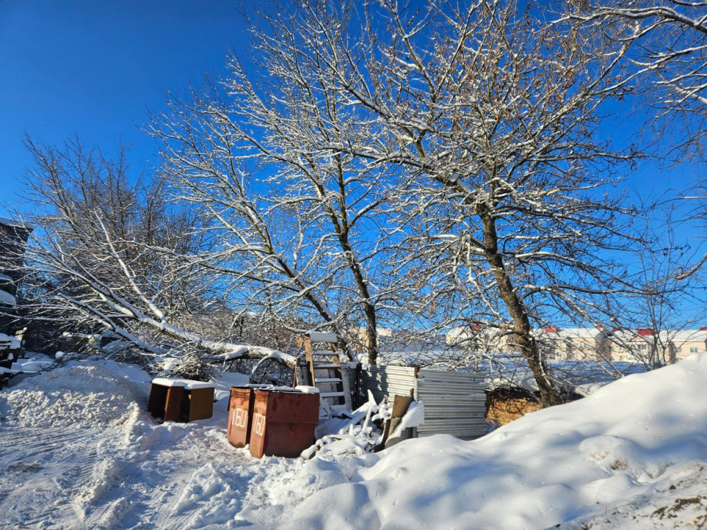 За площадкой для сбора мусора под снежными сугробами свалены крупногабаритные отходы.