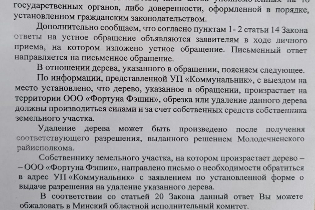 Общение с руководителем предприятия было безрезультатным. Максиму ответили, что без указания райисполкома ничего делать не будут. Услышав это, мужчина пошёл с райисполком. Однако итогом посещения приёма граждан стало не решение проблемы, а ещё одно обращение, теперь уже в Минский облисполком. В результате Максим получил ответ на него из райисполкома, в котором ему сообщили, что удаление дерева должно производиться силами и за счёт средств собственника земельного участка, в частности, ООО «Фортуна Фэшин».