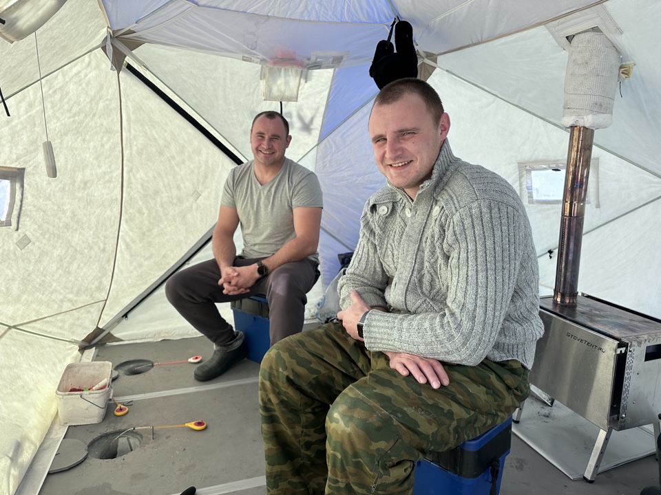 Братья Михаил и Константин приехали порыбачить на Вилейское водохранилище из Воложина. Они приехали с ночёвкой и разместились в палатке, которая обогревается печкой-буржуйкой.