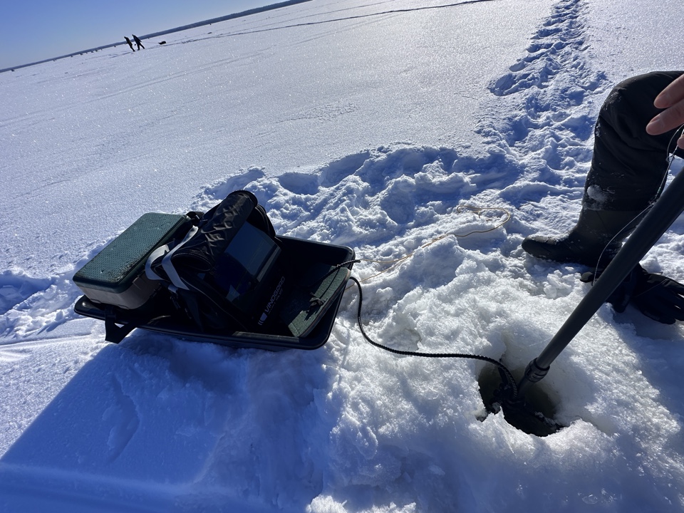 На улице -15°С, а в палатке комфортно, более 20°С тепла. Несмотря на глубину в этом месте, более 6 метров, рыбачить безопасно — лёд сейчас окрепший.