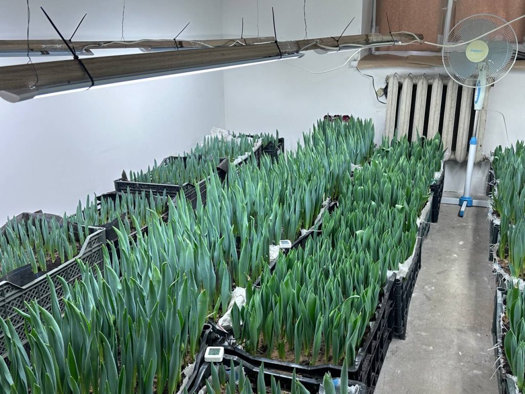 Луковицы голландских тюльпанов для посадки закупили ещё в конце сентября. До окончания ноября они хранились в гараже при температуре +5 градусов. Затем их начали высаживать в специальный грунт. После этого ящики занесли в дом, где они находились без света до начала января – такова технология.