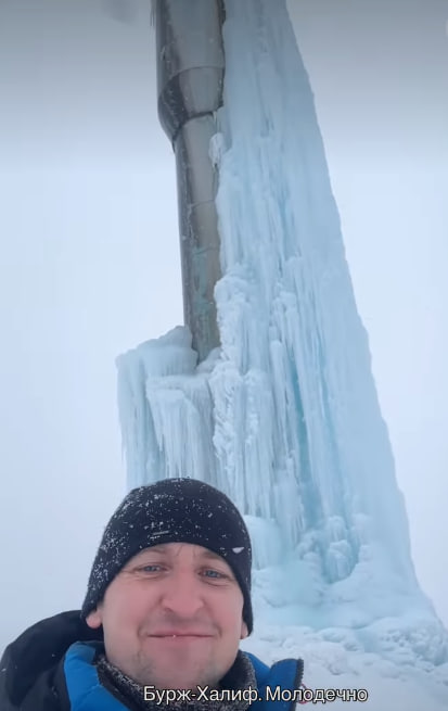 Автор ролика назвал замёрзший водопад, спадающий с переполненной башни, именем самого высокого небоскрёба — Бурдж-Халифа.