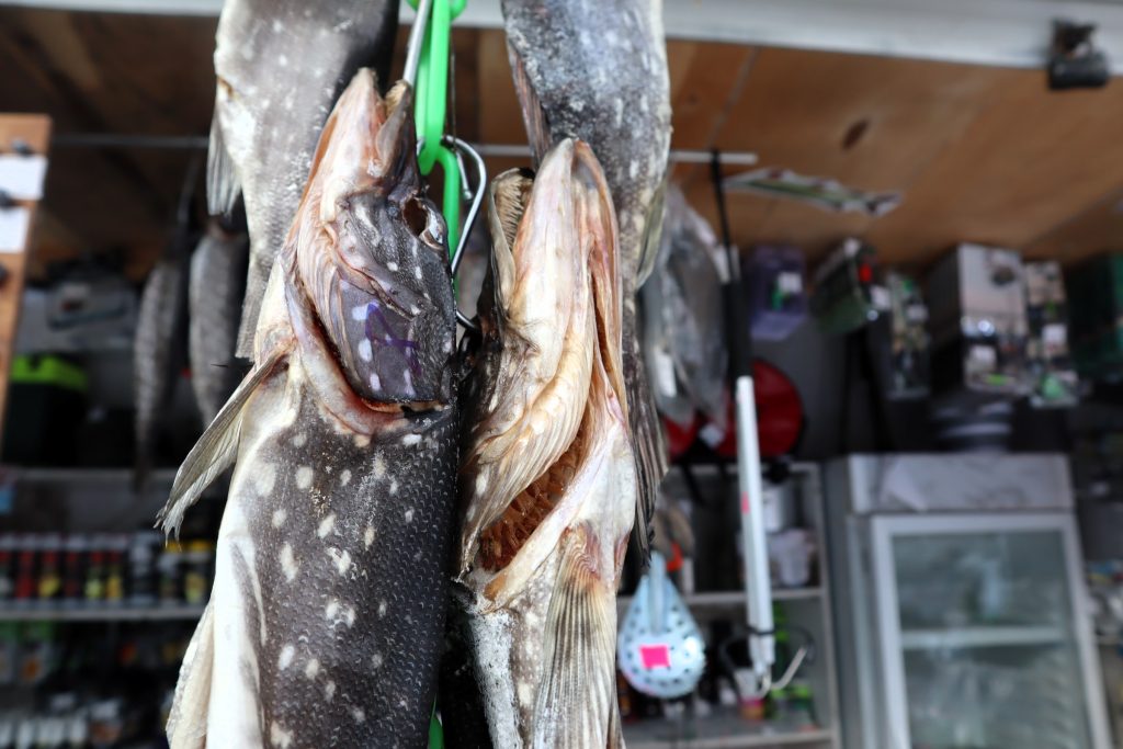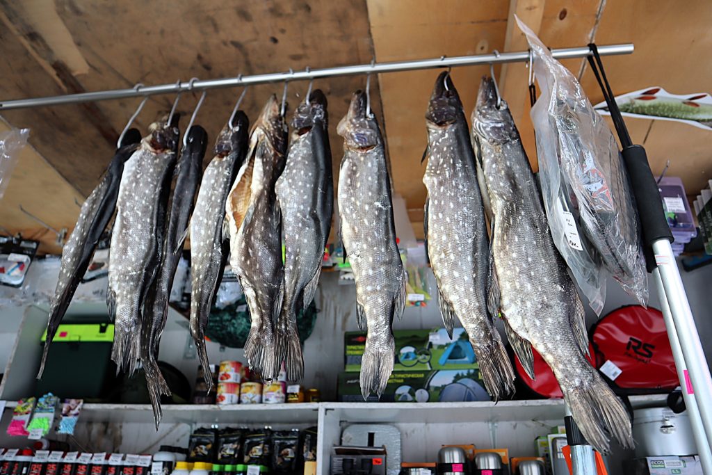 Вадим вывесил и продает целую гирлянду из сушеных щук. Он рассказал нашему порталу, что этих красавиц в Полочанах добыл на зимней рыбалке хозяин его торговой палатки Сергей.