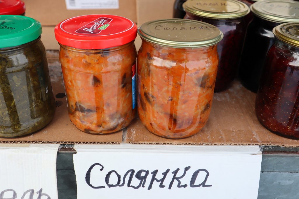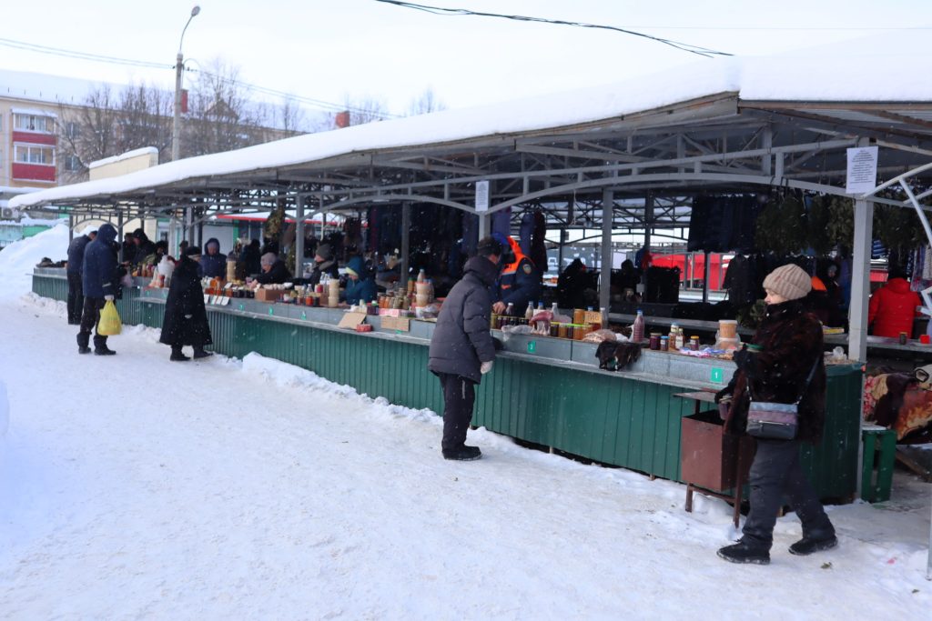 По сравнению с настоящими морозными днями ожил открытый торговый павильон, в котором народ продает закатки и маринады из выращенной своими руками вкуснятины, а также собранные в лесах грибы и ягоды в собственной переработке.
