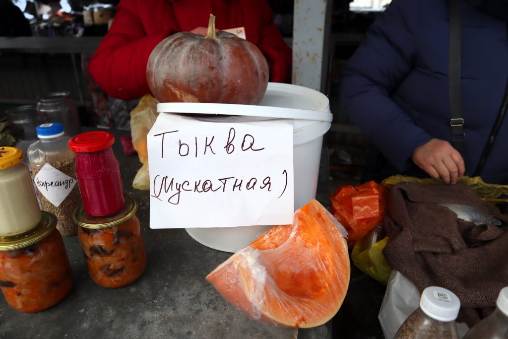 Появилась здесь в щадящий мороз мускатная тыква. Целиком этот овощ стоит 6 рублей, а отрезанный кусок – 3 рубля. И продавцы, и покупатели рассказали, что из мускатной тыквы каша знатная получается. А ещё ее в пироги добавлять можно.
