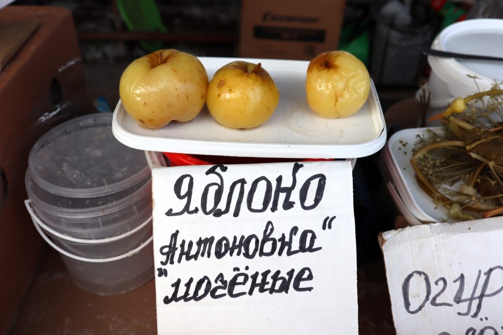 Из Сморгони к нам приехали мочёные яблоки, которые в сильный мороз хозяйка не привозила. Мочёная сморгонская антоновка продается по цене 10 рублей за кило.