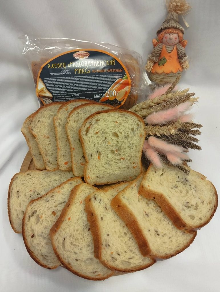 Хлебец «Молодечненский МИКС» — это булочное изделие, вырабатываемое из муки пшеничной высшего или первого сорта, с добавлением смеси для приготовления хлебобулочных изделий, сдобы и багетов «Спорт Актив». В составе содержатся семена льна масличного, морковь сушёная, пшеничная мука, семена подсолнечника, тыквы, глютен пшеничный, спельтовая мука, мука из пшеничного солода, сахар и прочее. Мука из спельты богата растительным белком. Считается, что она менее аллергенна, чем пшеничная мука высшего сорта.